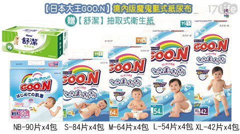 只要1799元(含運)即可購得【日本大王GOO.N】原價3390元境內版魔鬼氈式紙尿布1箱,尺寸:NB/S/M/L/XL,加贈【舒潔】棉柔舒適抽取式衛生紙1串。